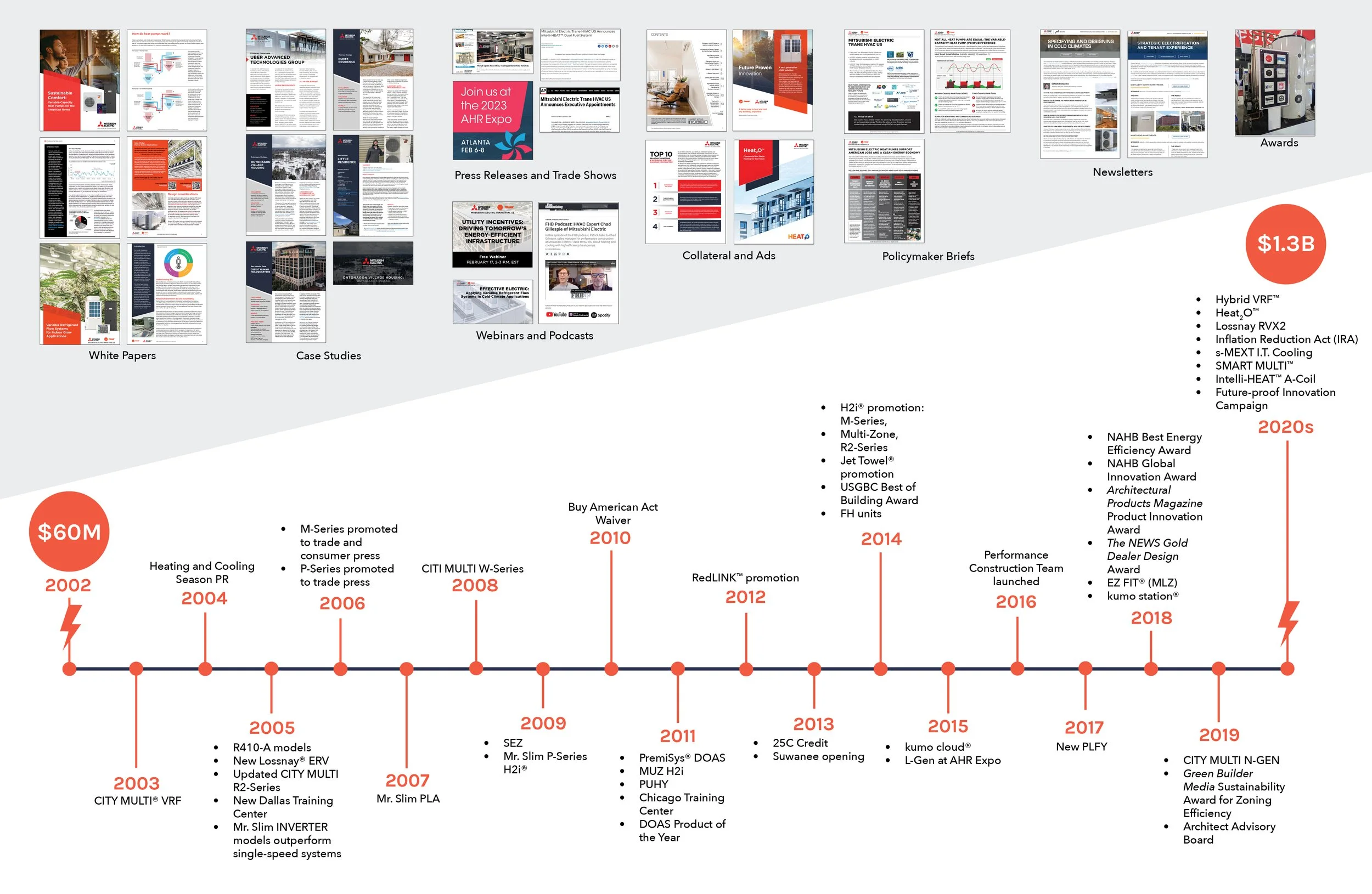 Over 21 years, and through the client’s 2018 transition to Mitsubishi Electric Trane HVAC US, our team helped the brand introduce and popularize modern inverter heat pumps and VRF technology in the U.S. market. We developed and executed a fully integrated B2B program, involving public relations, technical content, paid media and creative expertise. Our efforts elevated the brand to a preferred manufacturer and contributed to a significant increase in annual sales as we grew the VRF and heat pump categories together: from $60 million to over $1.3 billion.
