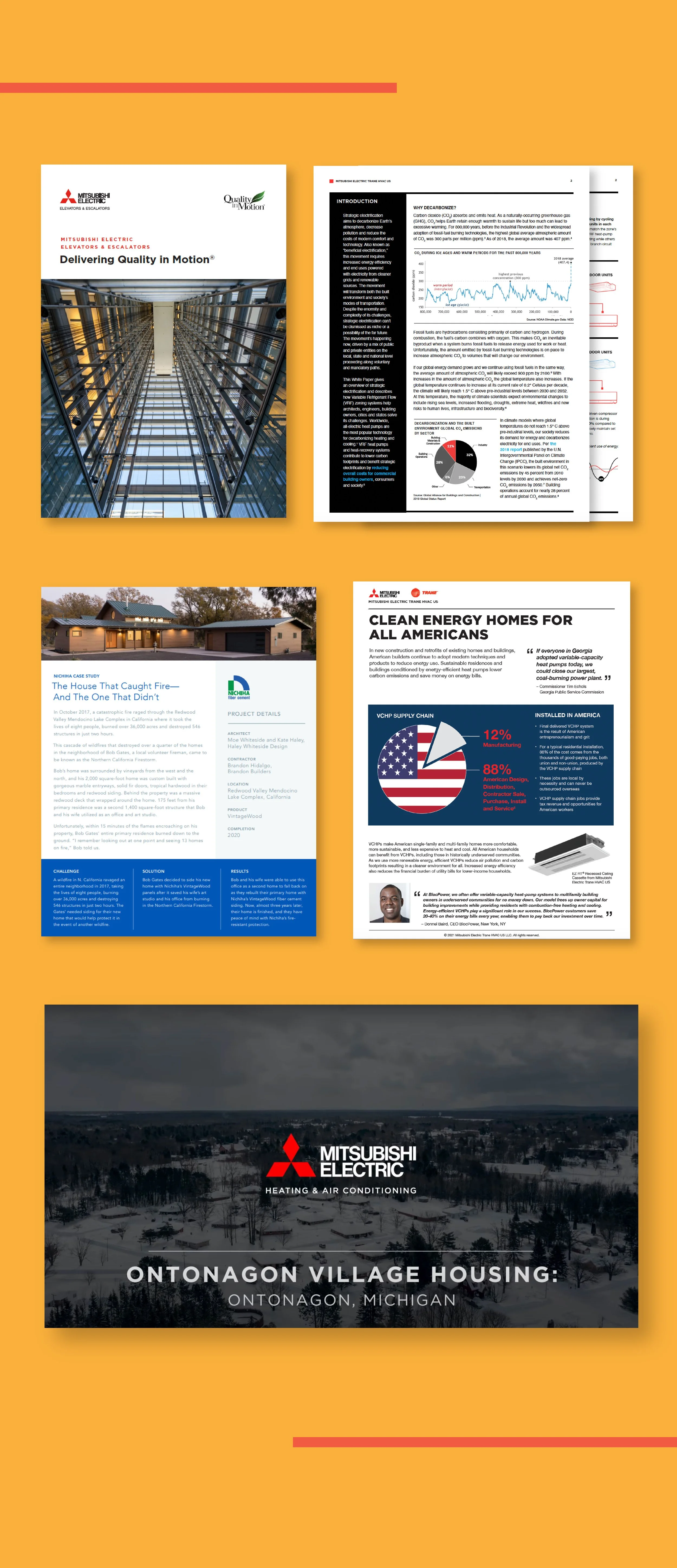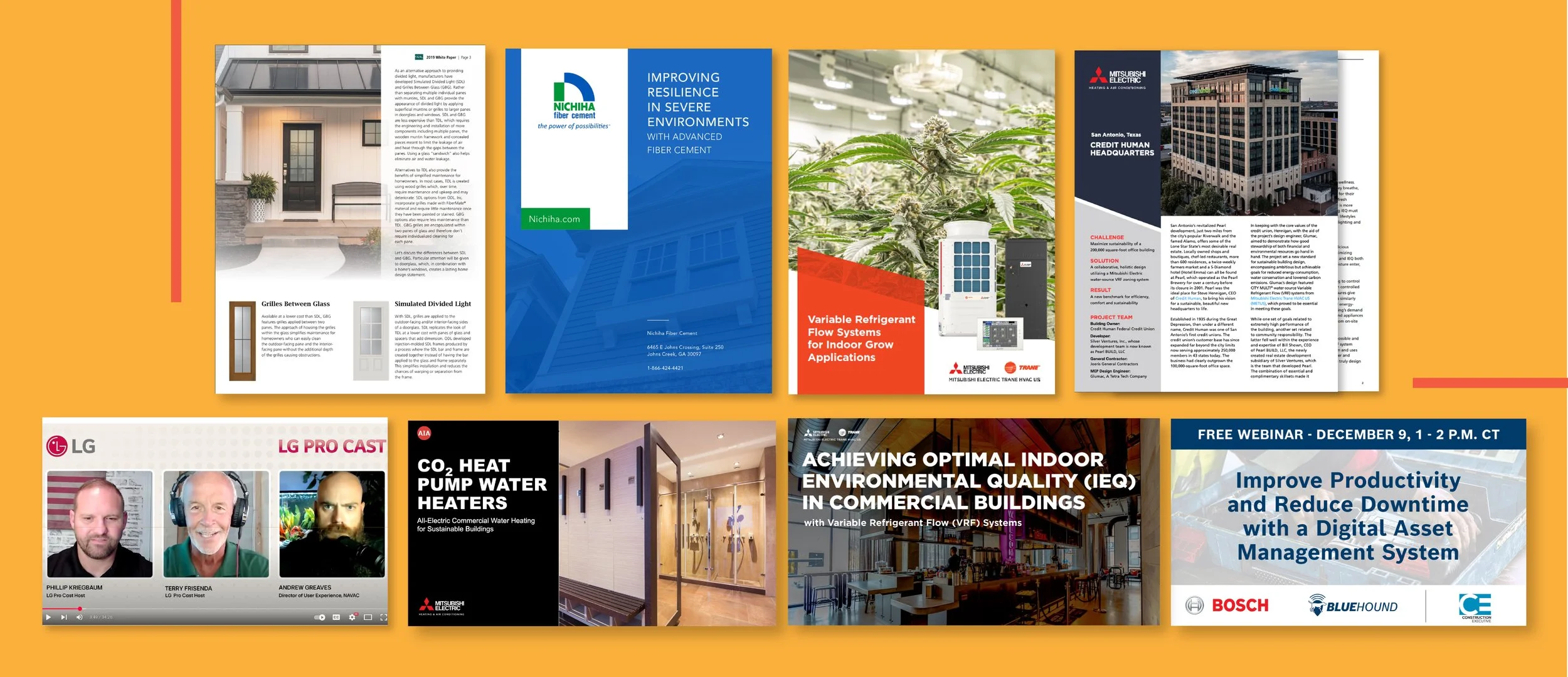 LMO-crafted case studies, white papers, newsletters, blogs, articles, eBooks, talking points, scripts, briefs, webinars and CEU courses contribute to popular and professional knowledge and perceptions of VRF systems, inverter heat pumps, heat-recovery technology, air-to-water heating and cooling technology, water-source heat pumps, heat pump chillers, cold-climate heat pump applications, dual-fuel systems, heat pump water heaters, resilient fiber-cement applications, elevators, escalators, door-glass applications, ventilation systems, indoor environmental quality (IEQ), comfort, zoning, residential electrification, the A2L refrigerant transition, building management systems (BMS), Lean construction and other subject areas.